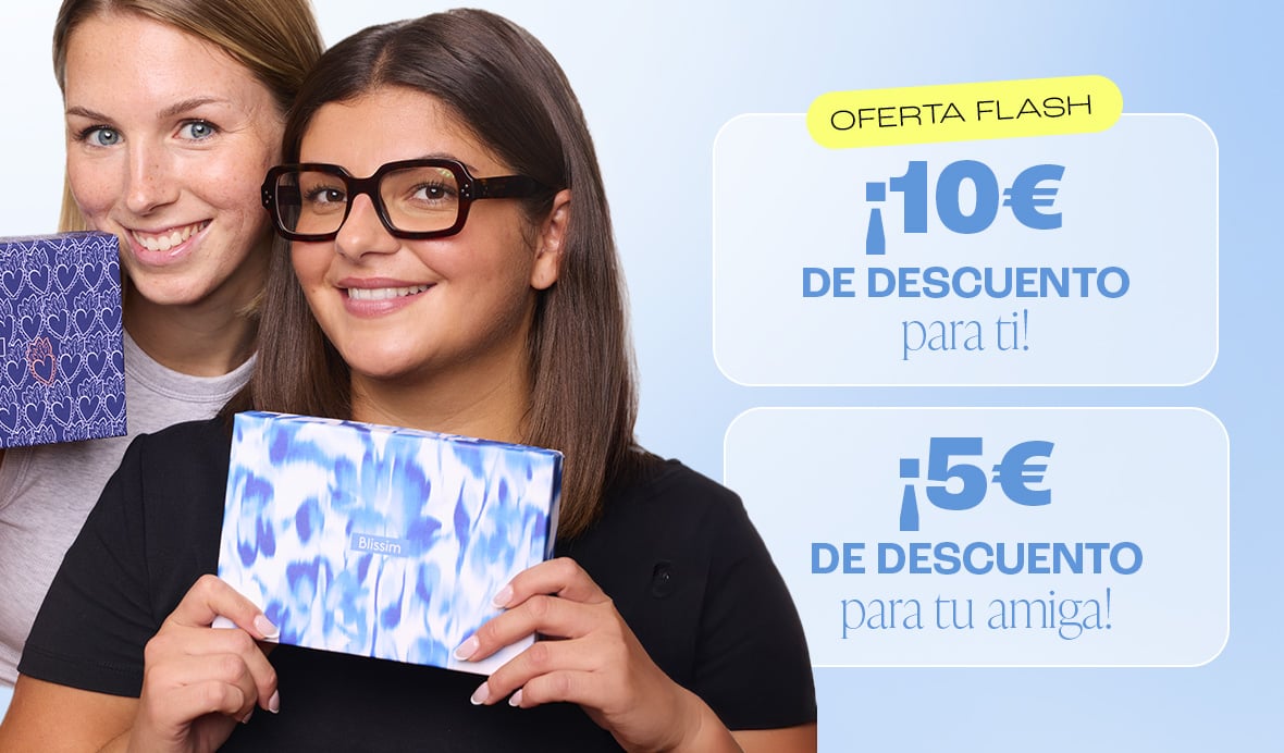 Oferta válida hasta el 04/01/26, con un límite de 5 apadrinamientos por persona, la oferta sólo es válida si la ahijada es nueva cliente y para un pedido a través de el enlace de recomendación de la madrina. Quedan excluidas otras ofertas promocionales. Para aprovechar la oferta, no es necesario estar suscrita a Blissim en el momento de enviar el enlace. A continuación, recibirás 10 euros de descuento en tu próxima caja y tu amiga recibirá 5 euros de descuento en su primera caja. El cupón se aplicará automáticamente a su próximo pago. Los descuentos de 10 euros no son acumulables en un mes. Por ejemplo, si has reclutado a dos amigas, el segundo descuento se trasladará al mes siguiente.